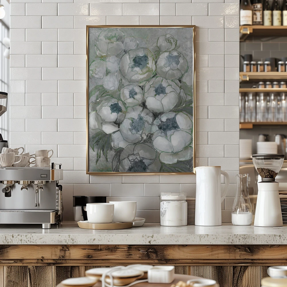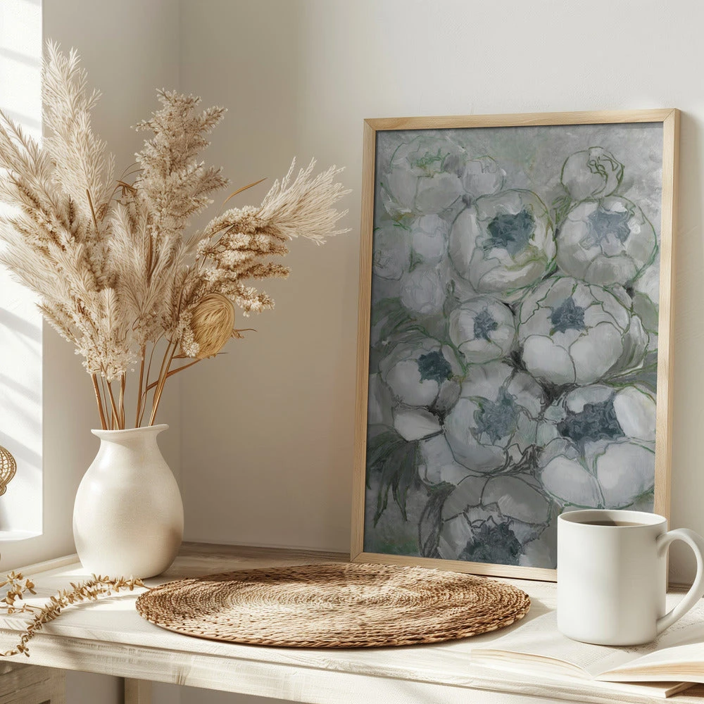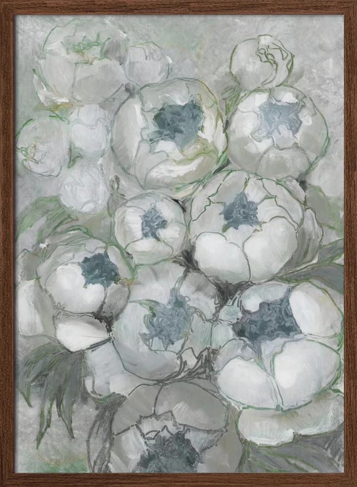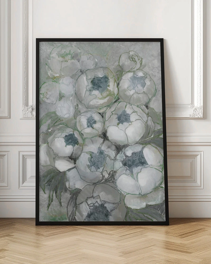 Explore our many print options for Nuria bouquet of peonies in teal and green by artist Rosana Laiz Blursbyai.